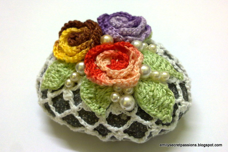 Another project  with multi-coloured flower blooms and swarovski pearls adorning the top of the crochet covered stone paperweight.