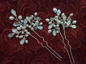 These U-shaped hair pins are done entirely with 18g wire and they measure 3" long. The top part which consists of freshwater pearls, swarovski pearls and bicones and Czech glass leave shaped beads were twisted together to form the sprayed part.